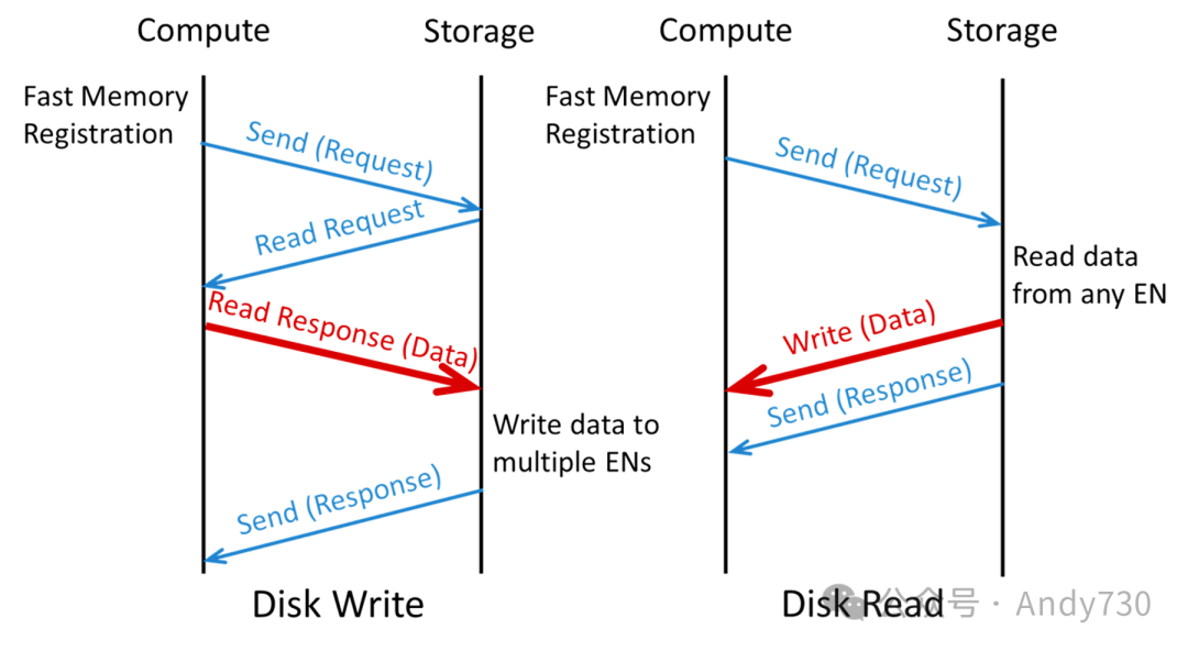 图5展示了sK-RDMA在读写硬盘时的数据流程。计算服务器首先发起快速内存注册(FMR,Fast Memory Registration)请求以注册数据缓冲区,随后发布RDMA发送请求,将包含硬盘I/O命令及FMR注册缓冲区描述的请求消息传输至存储服务器。根据InfiniBand(IB)规范,NIC会等待FMR请求完成后再处理后续发布的请求,确保请求消息在内存注册成功后才被推送到网络上。数据传输则由存储服务器根据收到的请求,通过RDMA读取或写入操作完成。传输结束后,存储服务器通过带失效的RDMA发送将响应消息返回给计算服务器。