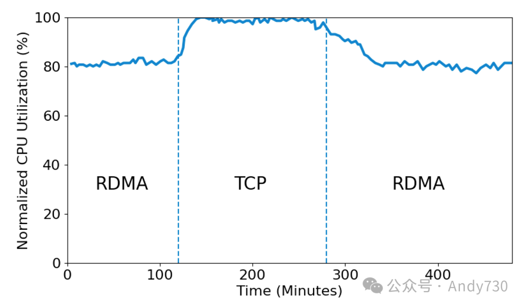 自2018年起,我们逐步为存储后端流量启用了RDMA;至2019年,我们又将RDMA拓展至客户前端流量。图1展示了2023年1月18日至2月16日期间Azure所有公共区域的流量统计数据。截至2023年2月,Azure中约70%的流量已通过RDMA传输,且区域内RDMA已在所有Azure公共区域得到全面支持。RDMA技术的成功应用,不仅显著提升了硬盘I/O性能,还有效减少了CPU核心的占用。