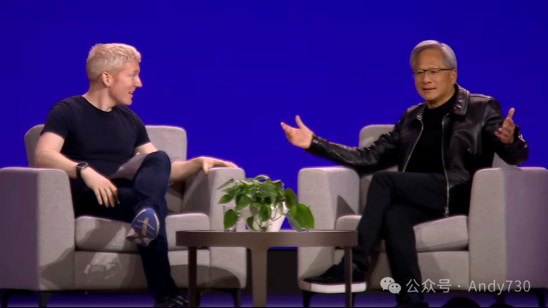 Jensen Huang: 我们是第一批投资自己的AI超级计算机的科技公司之一。我们再也不能设计芯片了,没有AI。晚上,我们的AI正在探索设计空间,我们自己永远不会做,因为探索这样的空间成本太高了。我们的芯片因为有了AI,所以变得更好了。我们可以减少用于芯片的能源量,性能更高。我们的软件——我们再也不能没有AI地编写软件了。我们必须探索所有的设计空间,优化编译器;这太大了。我们用AI来报告错误。我们的错误数据库实际上告诉你代码出了什么问题,谁可能涉及其中,并激活该人去修复它。我希望我们公司的每个组织中的每个人都非常积极地使用AI。我想把英伟达变成一个巨大的AI。那会多好啊?然后我就能实现工作与生活的平衡了。