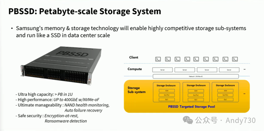 我们称PB级存储系统为PBSS(Petabyte-scale Storage System)。在当下,超高密度和精准存储系统已成为一大趋势,相关新闻层出不穷。之所以称其为PB级存储,是因为单一系统能够轻松容纳超过PB级别的多块SSD设备。我们主要面向数据中心集群和存储系统,PBSS在我们的数据系统中扮演着SSD的角色,而数据中心本身则类似于一台大型计算机。