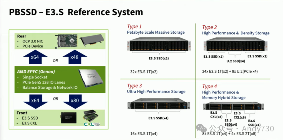 第三种系统针对高性能应用,如数据库,每个驱动器支持x4 PCIe通道,以提供最佳性能。 第四种系统则针对新型设备如CXL设备,系统可容纳四个E3.S 2T设备,支持CXL设备安装。