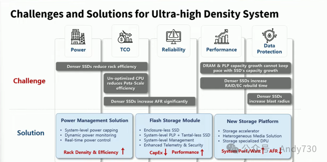 在功耗方面,使用EDSFF E3驱动器和Gen5驱动器时,典型功耗超过21瓦。若在单一系统中安装32个21瓦的驱动器,其功耗将占据系统总功耗的50%以上。因此,我们正在研究降低功耗和优化TCO的技术。 在TCO方面,除了驱动器,控制器也需要高性能且昂贵的CPU来处理工作负载,我们正在寻找新平台以降低数据中心的OpEx和CapEx。 在可靠性、性能和数据保护方面,以RAID为例,假设有32TB设备,需要某种保护机制,因为重建工作既耗时又消耗大量资源。这是我们正在研究的领域,目前正探索一些解决方案,包括功率管理解决方案以管理超高密度存储系统的SSD功率,以及高效存储设备的新存储平台和更好的数据保护方法。
