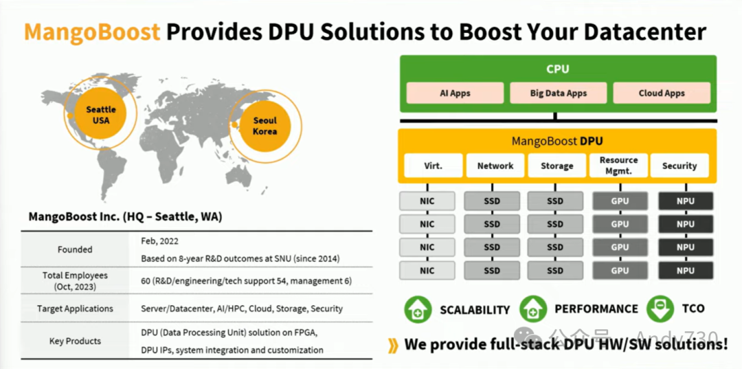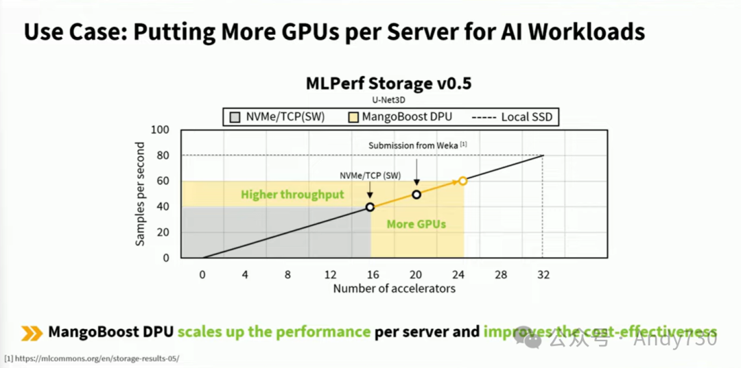 这是一个十分出色的用户案例。我们的一个客户案例展示了在单个计算服务器中,通过增加GPU数量,我们显著提升了AI性能。在MLPerf基准测试中,对于这一远程存储配置的存储基准测试结果,灰色区域代表了软件基线,因为它需要大量的CPU核心来为GPU提供数据。由于CPU瓶颈,许多加速器和GPU的性能在大约40个样本/秒时便达到饱和。通过一些软件优化措施,性能得到了提升。观察中间的圆圈,你会发现WEKA的提交表现优于NVMe over TCP的软件基线。而右侧的黄色圆圈则展示了我们的成果,我们成功释放了CPU资源,使得服务器能够容纳更多的GPU,最终我们的性能超越了软件实现。总结来说,Mangoboost的DPU能够显著提升每台服务器的性能,这对于提高AI工作负载大规模基础设施的成本效益具有重要意义。