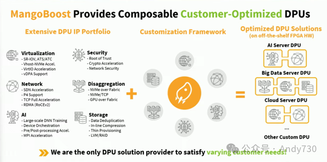 我们的解决方案和商业模式独具特色。我们的首款产品是基于商用FPGA设备的可组合DPU架构。可能有人对DPU领域的可组合性有所疑问。虽然Pensando和NVIDIA BlueField等知名品牌广为人知,但DPU的可组合性或许还是个新鲜词汇。我们拥有众多涵盖不同领域的硬件加速IP。我们深入了解客户和合作伙伴的需求,明确他们的目标规格和关键应用,然后设计客户驱动的DPU架构,以满足其特定的基础设施和环境需求。