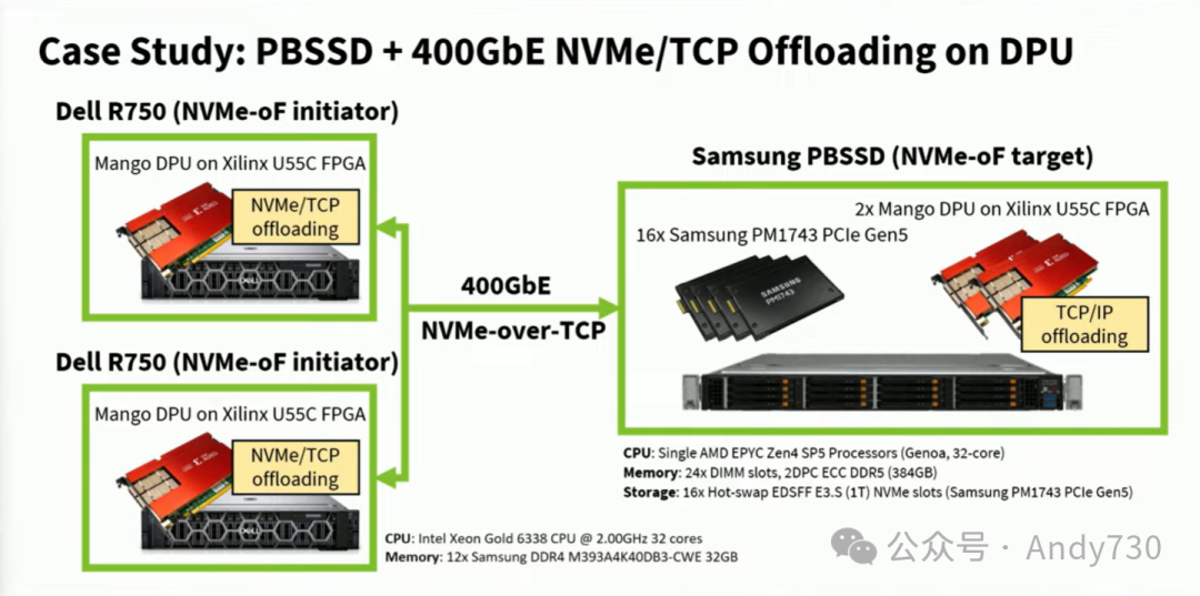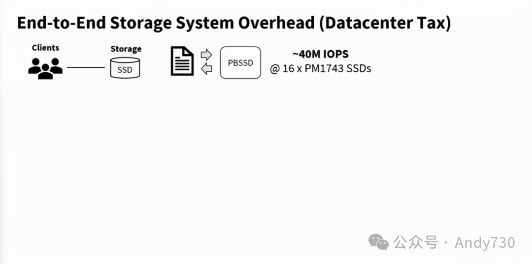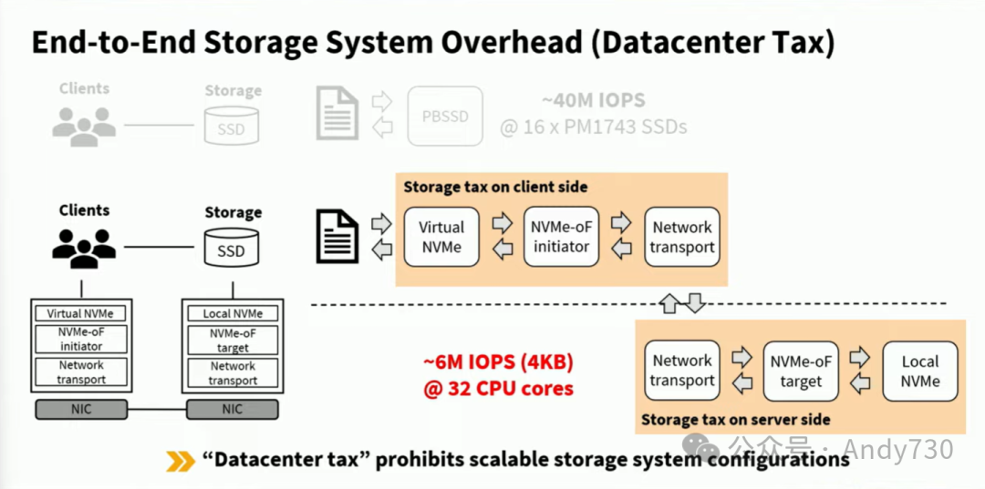 为了充分利用PB级SSD的性能,我们需要通过高带宽网络结构将多个客户端连接起来,并在客户端和服务器上运行专门的存储基础设施管理软件。举例来说,我们需要为主机应用程序提供一个NVMe设备视图,并使用NVMe over Fabrics协议来访问实际分散的NVMe设备。这个协议通常运行在网络传输层上,如TCP/IP、RoCEv2或InfiniBand。在存储服务器端,情况也类似。传统设计非常耗费资源,特别是主机CPU核心。这正是性能无法达到理想状态的原因,因为CPU端存在瓶颈。如今,这被称为“数据中心税”或“存储税”,意味着你需要支付宝贵的资源,如主机CPU核心,或在数据中心中花费大量资金购买高端SSD。