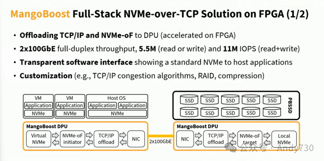 因此,在这个项目中,我们首要关注的是DPU上的NVMe over TCP加速。我们的解决方案不依赖于FPGA板上的小型嵌入式处理器,主要的数据路径和数据处理都在我们的定制架构上进行了加速。我们提供了抽象层,隐藏了所有复杂性,用户将我们的DPU视为标准的本地NVMe设备。但在DPU内部,这将被转换为NVMe over Fabrics上下文,客户端和服务器之间的消息通过我们的TCP/IP卸载引擎进行封装或解封装。我们的产品实现于FPGA芯片上,因此我们也提供了一些定制化解决方案。