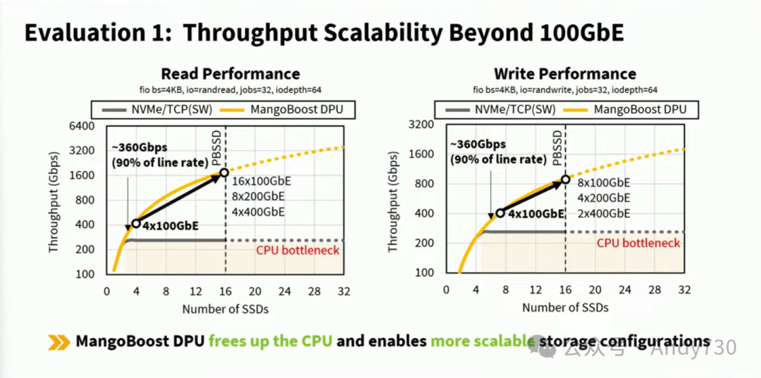 首先,我们测量了随着SSD数量增加的读写性能。软件NVMe over TCP基线无法实现可扩展的吞吐量,性能被限制在200Gbps,即使完全利用了32个AMD CPU核心。然而,通过我们的技术,PBSS可以实现约400Gbps的性能。我们相信,通过增加更多的PCI通道、更高的PCI代数以及更多的DPU卡,我们能够将当前性能提升至理想的1.6Tbps。因此,我们得出的结论是,最终需要DPU以及一些硬件加速解决方案,因为当前的CPU核心无法有效处理超过100Gbps的现代存储栈。