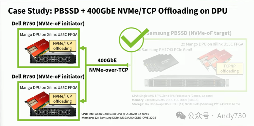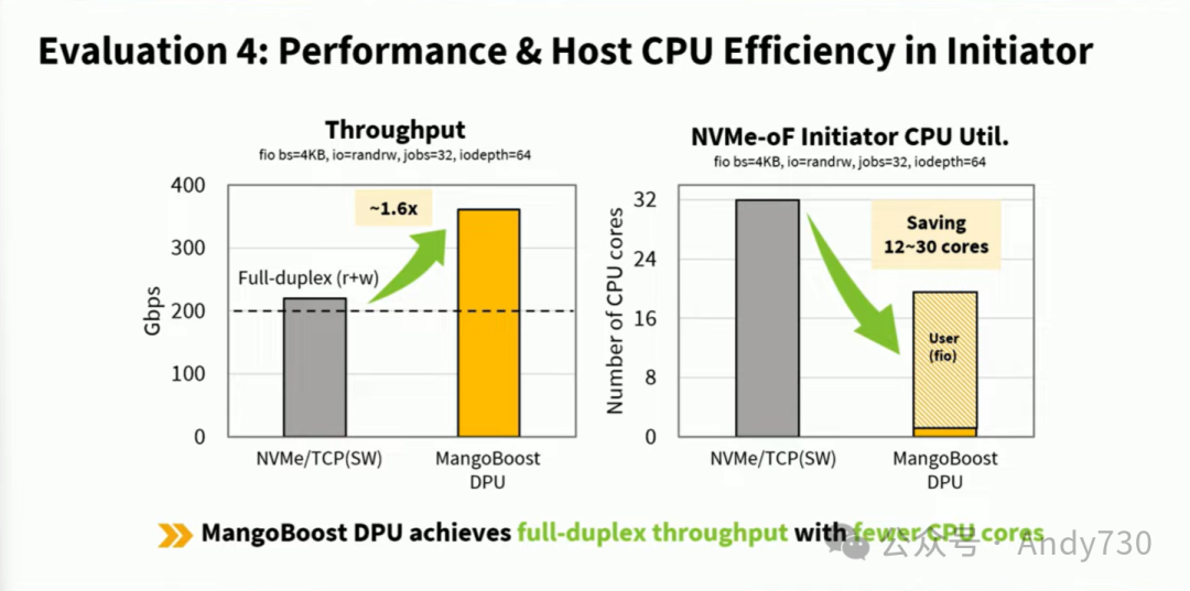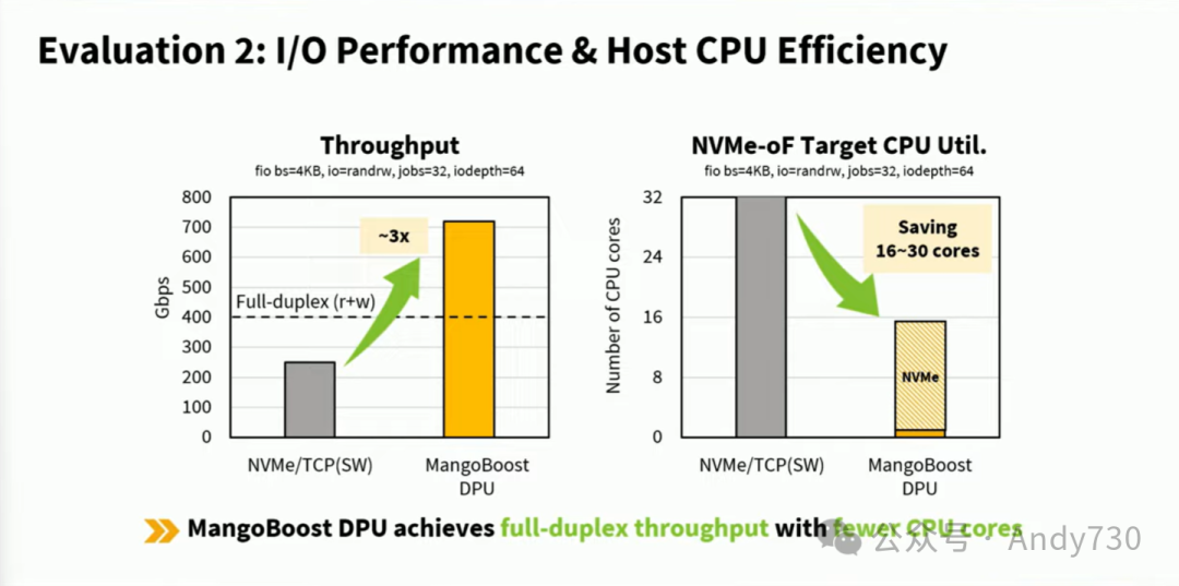 这张幻灯片总结了性能和主机CPU效率。我们的DPU增强解决方案可以提供全双工性能,即每方向400Gbps,总带宽高达800Gbps。同时,通过将TCP/IP栈卸载到硬件,我们的DPU可以节省大量的CPU核心,大约可以节省15个核心。通过将NVMe目标卸载IP集成到我们的DPU解决方案中,最终可以节省所有剩余的核心。