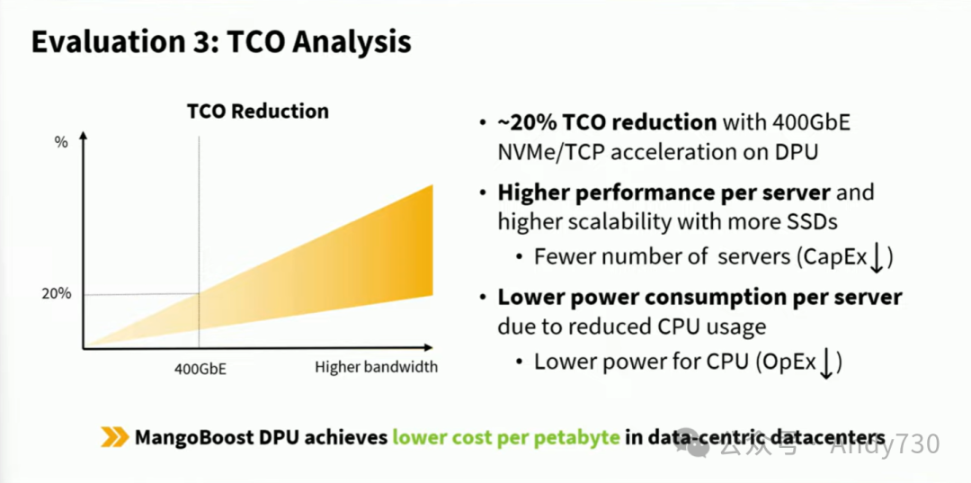 这是我们对TCO分析的初步结果,我们构建了一个自定义模型来预测TCO的减少,发现我们的DPU在当前规格下可以将TCO降低多达20%。这主要得益于两个因素:一是我们的DPU提高了每台服务器的性能,因此用户可以用更少的服务器满足其需求;二是由于减少了CPU利用率,DPU增强的PBSS每台服务器的功耗更低。
