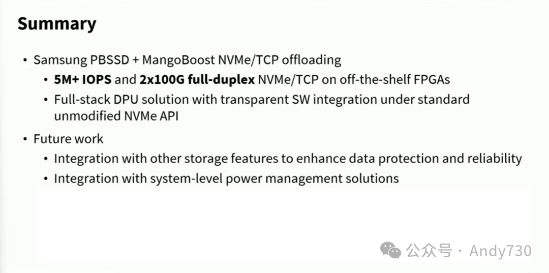 总结一下,我们简要回顾了与三星和Mangoboost的合作成果,并展望了未来的工作计划。我们将进一步整合其它软件功能,如RAID、数据压缩或数据保护功能到我们的DPU解决方案中。此外,我们还计划在我们的DPU中集成一些系统级电源管理解决方案。