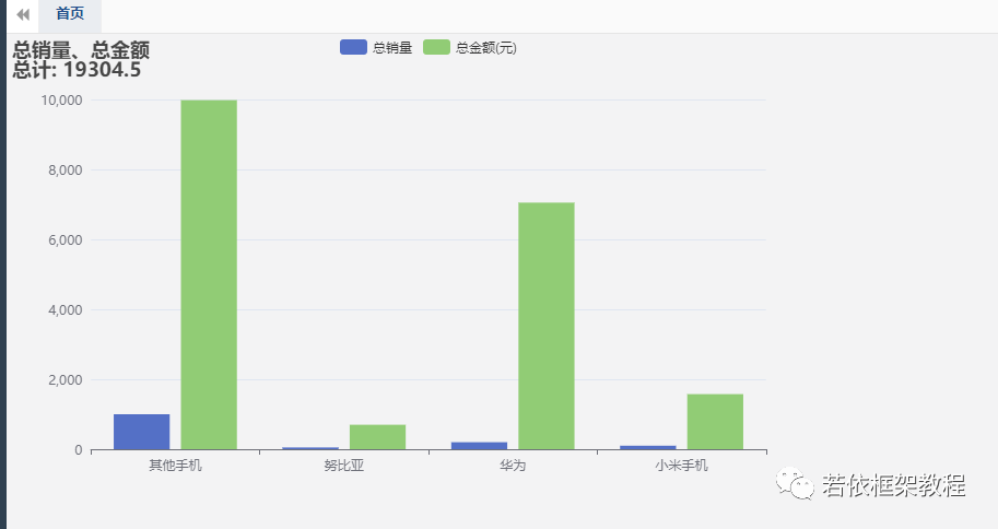 <div class="row"><div id="mt21tj" class="col-sm-6" style="height: 450px"></div></div><script type="text/javascript">$.when($.getJSON(ctx+'system/goods/getData'),$.getJSON(ctx+'system/goods/getCtn')).done(function (dta1,dta2) {var myChart = echarts.init(document.getElementById('mt21tj'));var dta=dta1[0];var tagName=[];var tagZje=[];var tagGxl=[];for(let i = 0;i<dta.length;i++){tagName[i]=dta[i].gname;tagGxl[i]=dta[i].gxl;tagZje[i]=dta[i].zje;}var option = {title: {text: '总销量、总金额'+'\n'+'总计: '+dta2[0]},tooltip: {},legend: {data: ['总销量', '总金额(元)'],verticalAlign: 'middle',layout: 'vertical'},xAxis: {data: tagName,},yAxis: {},series: [{name: '总销量',type: 'bar',data: tagGxl}, {name: '总金额(元)',type: 'bar',data: tagZje}]};myChart.setOption(option);});</script>