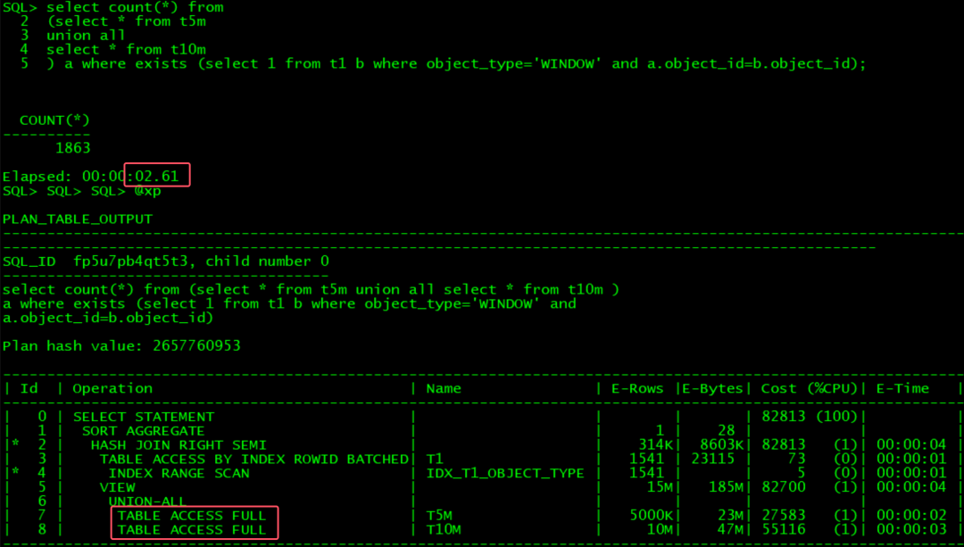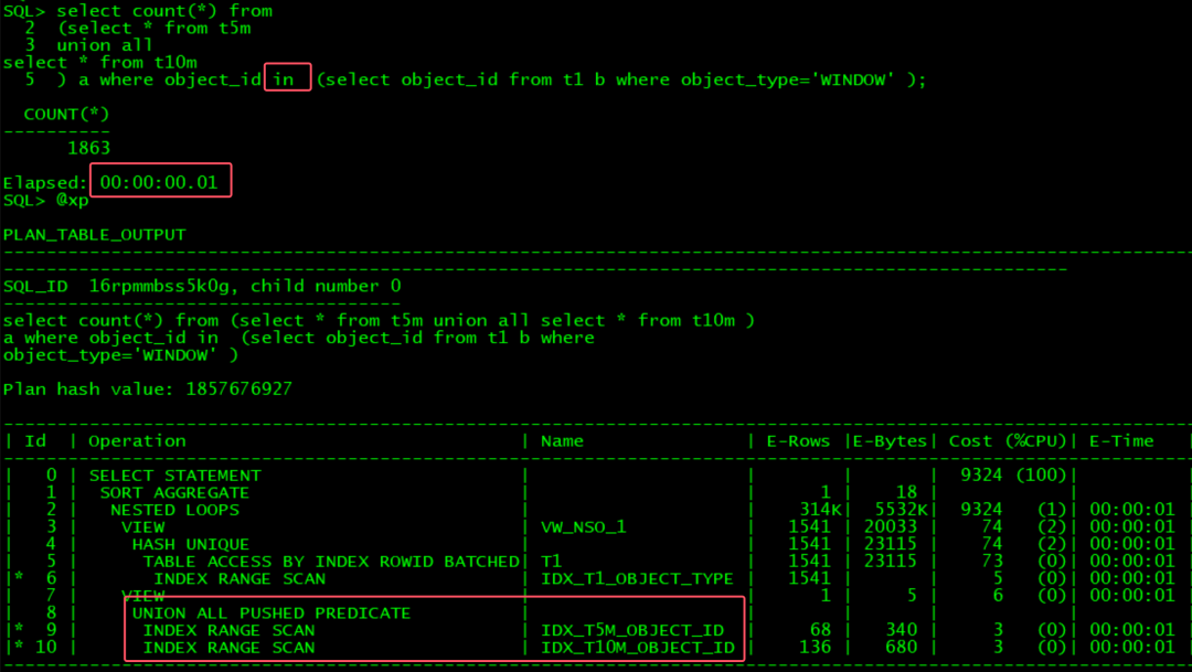 这个SQL, oracle如果要达到OB同等效率, 必须要改写. 有3种方法,可以将exists改成in,或者改成inner join, 或者将小union 拆分成大union :