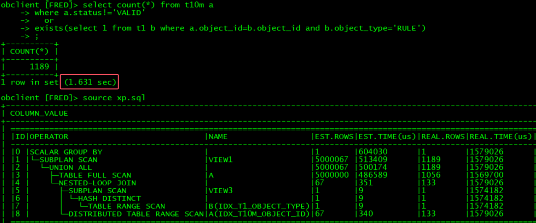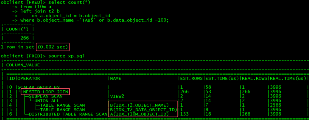 OB可以自动识别出是inner join,执行效率非常高: