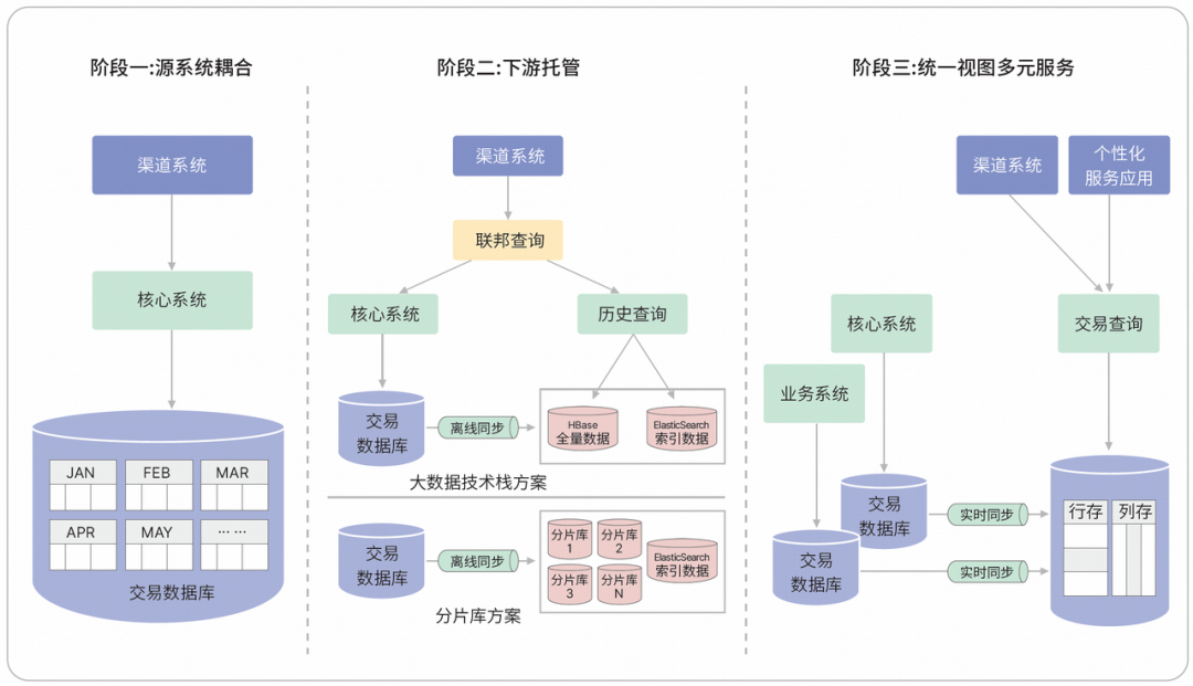 业务应用形态以“下游托管”为代表。采用准实时或离线数据交换的方式将交易系统明细数据同步到下游的查询系统,根据数据同步频率,接管部分或全部的查询服务。这一阶段多采用 Hadoop 大数据生态或分库分表中间件架构为主。前者通过批量任务完成标签化,支持离线多维度查询;后者则通过数据拆分实现高并发下的明细查询。