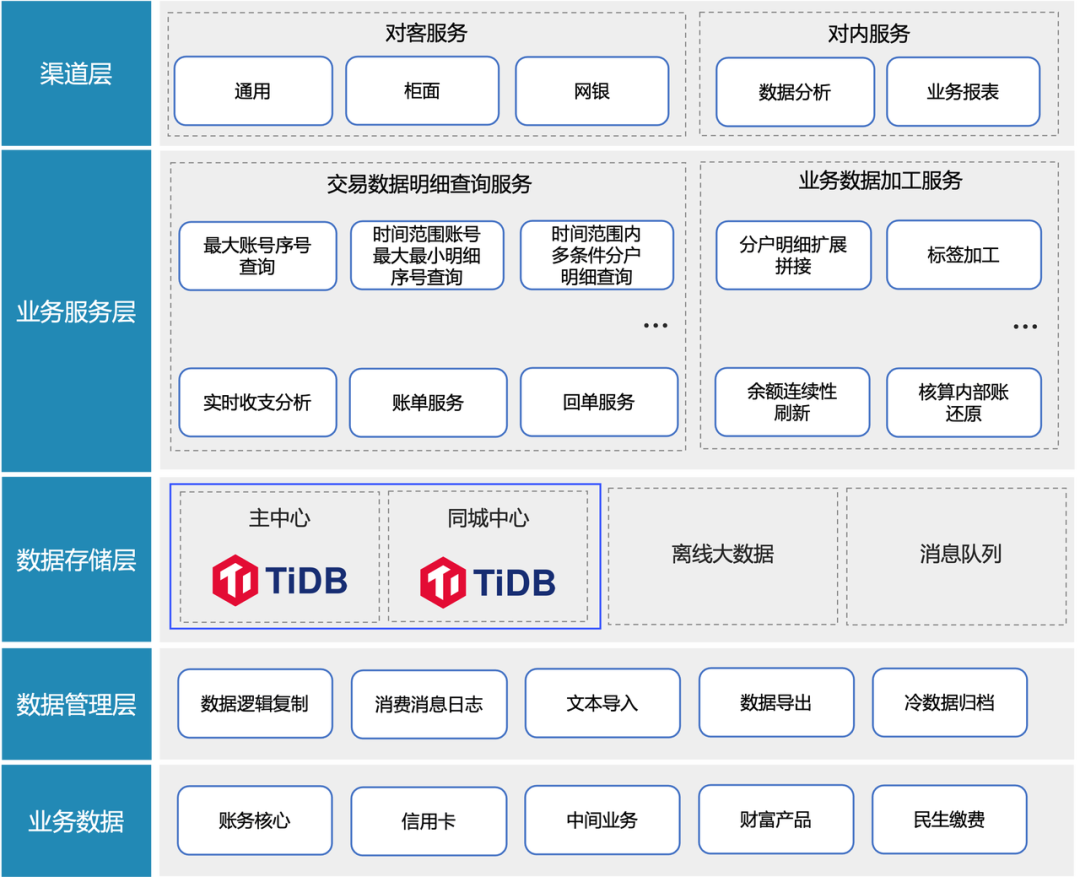 随着金融数字化转型的深入,越来越多的金融业务向个性化、精细化、智能化方向发展,其对底层数据库也提出更高要求,包括对海量规模、实时分析、高并发访问等。传统数据库架构已难以满足上述需求,急需完成技术架构升级。作为典型金融场景之一,交易明细查询作为基础服务发挥着关键作用,其背后的银行卡交易流水记录对个人和企业的财务管理至关重要,同时也是贷款审批、税务申报及司法审计等过程中不可或缺的数据支撑。交易明细查询通常指依托交易类数据的存储和服务、由渠道类系统提供展现的客户级交易记录列表、详情查询等服务,属于典型的数据类服务,具有明显的时间访问特征。金融业务的数字化转型推动了银行交易明细查询系统的变革。交易明细数据的使用呈现出新的特点:一方面查询方式从传统柜台扩展到手机和网上银行等多种方式,其查询时间跨度也从三个月、六个月延长到三年甚至五年以上。这对于底层数据平台提出了更高的要求,包括在查询方式多样化、时间跨度灵活性、查询实时性以及海量数据存储等诸多方面。
