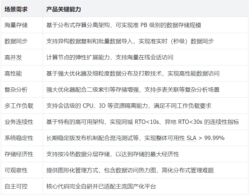 针对上面解决方案,我们将场景需求与产品关键能力对应起来。也就是说一款产品适合某场景的原因所在。