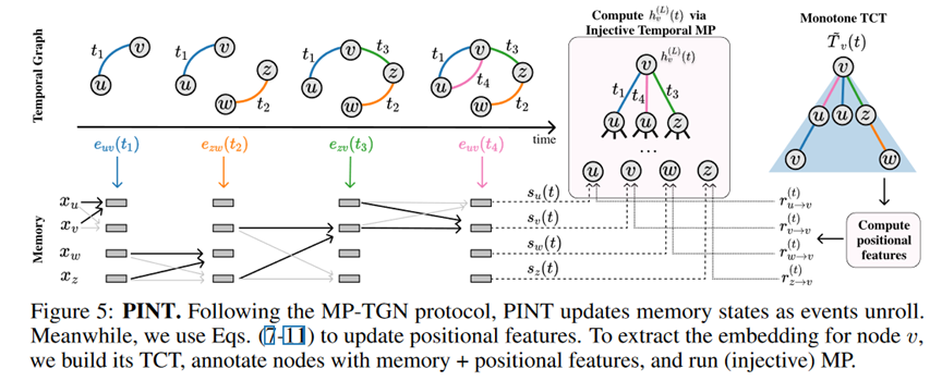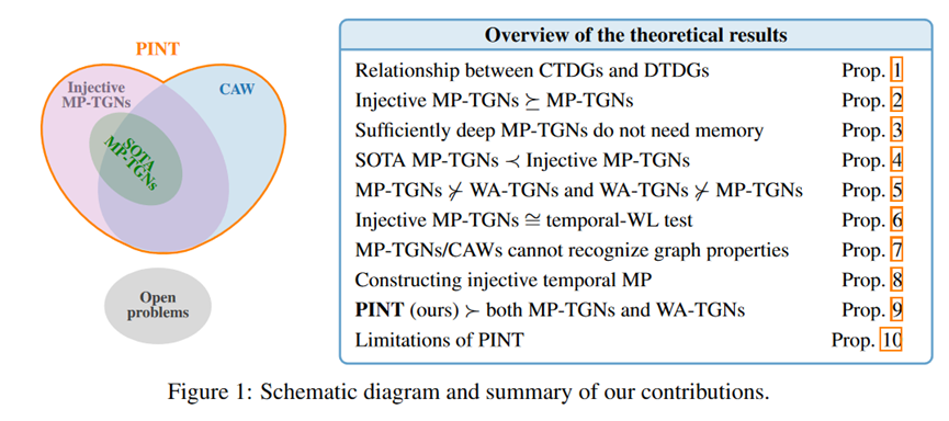 时态图网络(Temporal graph networks, TGNs)作为嵌入动态交互的模型已经引起了广泛关注,但其理论基础尚不明朗。作者建立了关于两类主要TGN(即汇总时间路径(temporal walks)的WA-TGNs和通过递归内存模块增强局部消息传递的MP-TGNs)表现能力及其局限性的基本结果。具体来说,新的构造揭示了MP-TGNs和WA-TGNs的不足,证明了这两类模型互不包含。作者将1-WL(Weisfeiler-Leman)测试扩展到时态图,表明最强大的MP-TGNs应使用单射更新,因为在这种情况下,它们的表达能力与时间版WL相当。此外,作者表明,足够深的MP-TGNs无法从内存中获益,且MP/WA-TGNs无法计算如围长等图属性。这些理论见解引导作者提出了PINT——一种利用单射时间消息传递和相对位置特征的新架构。PINT的表达能力被证明比MP-TGNs和WA-TGNs都更强,并且在多个真实世界基准测试中显著优于现有的TGN模型。