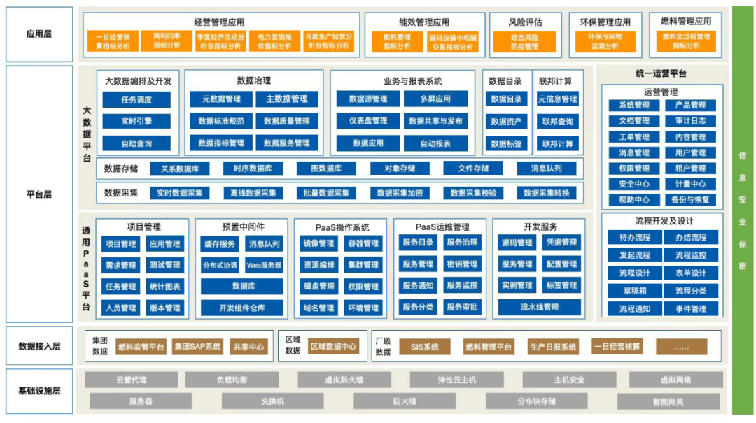 基于国双自有产品能力,专家团队迅速形成了可落地的技术架构和方案,运用PaaS运维管理模块实现与华能云统一远程部署、升级、运维的融合,提供统一的运行、运维、监控配置接口;上层中间件更内置包含权限认证服务、数据治理、安全中台、时序数据仓库、大数据环境、业务与报表以及集团统一的数据共享服务组件、业务开发组件、流程服务组件,流畅的完成了与集团统一技术开发平台、统一数据共享平台以及流程应用平台的顺利对接,实现对企业业务高频所需的三条主线应用服务的支撑,同时有效完成了整个集团架构融合统一与互联互通的实现。