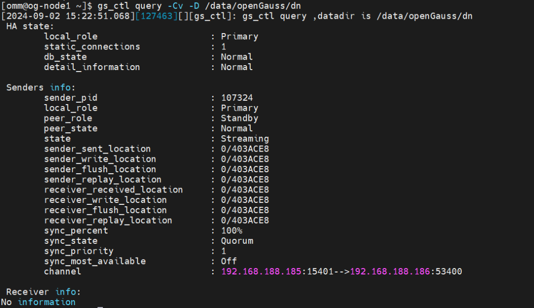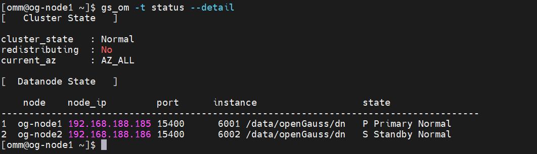 [omm@og-node1 script]$ ./gs_install -X /home/omm/cluster_config.xmlParsing the configuration file.Check preinstall on every node.Successfully checked preinstall on every node.Creating the backup directory.Successfully created the backup directory.begin deploy..Installing the cluster.begin prepare Install Cluster..Checking the installation environment on all nodes.begin install Cluster..Installing applications on all nodes.Successfully installed APP.begin init Instance..encrypt cipher and rand files for database.Please enter password for database:Please repeat for database:begin to create CA cert filesThe sslcert will be generated in /opt/openGauss/app/share/sslcert/omCreate CA files for cm beginning.Create CA files on directory [/opt/openGauss/app_48a25b11/share/sslcert/cm]. file list: ['cacert.pem', 'server.key', 'server.crt', 'client.key', 'client.crt', 'server.key.cipher', 'server.key.rand', 'client.key.cipher', 'client.key.rand']Non-dss_ssl_enable, no need to create CA for DSSCluster installation is completed.Configuring.Deleting instances from all nodes.Successfully deleted instances from all nodes.Checking node configuration on all nodes.Initializing instances on all nodes.Updating instance configuration on all nodes.Check consistence of memCheck and coresCheck on database nodes.Successful check consistence of memCheck and coresCheck on all nodes.Configuring pg_hba on all nodes.Configuration is completed.Starting cluster.======================================================================Successfully started primary instance. Wait for standby instance.======================================================================.Successfully started cluster.======================================================================cluster_state : Normalredistributing : Nonode_count : 2Datanode Stateprimary : 1standby : 1secondary : 0cascade_standby : 0building : 0abnormal : 0down : 0Successfully installed application.end deploy..