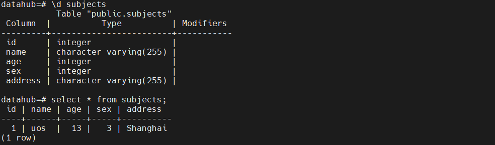 \c datahubCREATE TABLE subjects ( id int, name varchar(255), age int, sex int, address varchar(255) );