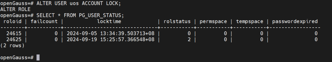 openGauss=# ALTER USER uos ACCOUNT LOCK;