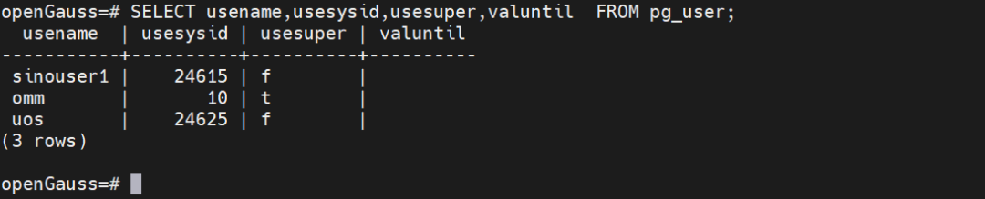 openGauss=# ALTER USER uos ACCOUNT UNLOCK;
