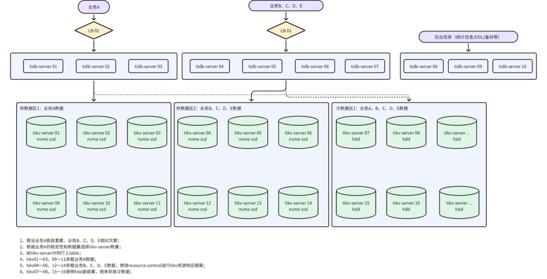 对于策略myplacementpolicyb下,业务B、C、D、E热数据共享6个tikv-server,使用resource-control进行一定隔离. 对于策略myplacementpolicyall下的所有业务A、B、C、D、E冷数据共享,也使用resource-control进行一定隔离. CREATE RESOURCE GROUP IF NOT EXISTS bussinessa RU_PER_SEC = 200000 BURSTABLE; CREATE RESOURCE GROUP IF NOT EXISTS bussinessb RU_PER_SEC = 50000 BURSTABLE; CREATE RESOURCE GROUP IF NOT EXISTS bussinessall RU_PER_SEC = 20000 BURSTABLE; CREATE USER 'bussiness-a'@'%' IDENTIFIED BY '123' RESOURCE GROUP bussinessa; CREATE USER 'bussiness-b'@'%' IDENTIFIED BY '123' RESOURCE GROUP bussinessb; CREATE USER 'bussiness-all'@'%' IDENTIFIED BY '123' RESOURCE GROUP bussinessall; |