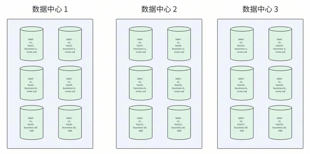 # 策略myplacementpolicya,存放业务A热数据 CREATE PLACEMENT POLICY myplacementpolicya PRIMARY_REGION="bussiness-a" REGIONS="bussiness-a"; # 策略myplacementpolicyb,存放业务B、C、D、E热数据 CREATE PLACEMENT POLICY myplacementpolicyb PRIMARY_REGION="bussiness-b" REGIONS="bussiness-b"; # 策略myplacementpolicyall,存放业务A、B、C、D、E热数据 CREATE PLACEMENT POLICY myplacementpolicyall PRIMARY_REGION="bussiness-all" REGIONS="hdd"; |