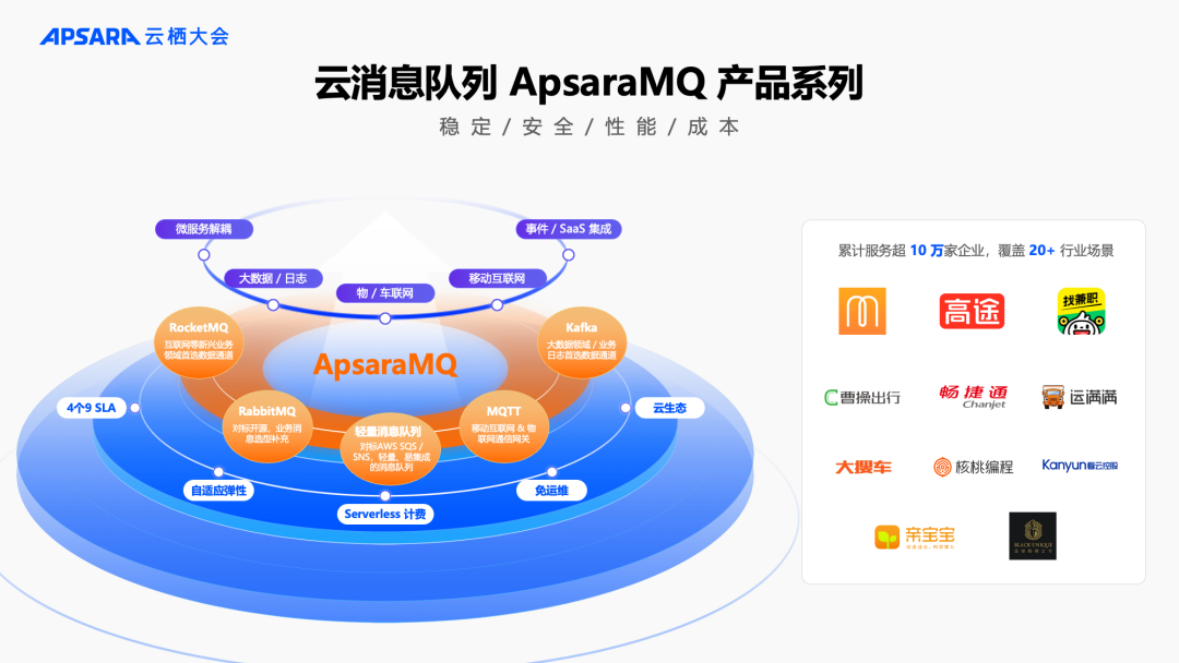 云消息队列 ApsaraMQ 是涵盖 RocketMQ、Kafka、RabbitMQ、MQTT、轻量消息队列(原 MNS)的消息队列产品体系,致力于“高弹性低成本、更稳定更安全、智能化免运维”三大核心方向的发展与创新,已累计服务超 10 万家企业,覆盖 20+ 行业场景。