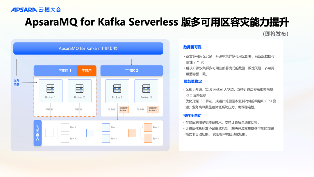 ApsaraMQ for Kafka 基于其存算分离架构和 Serverless V3 版本,持续提升多可用区容灾能力: