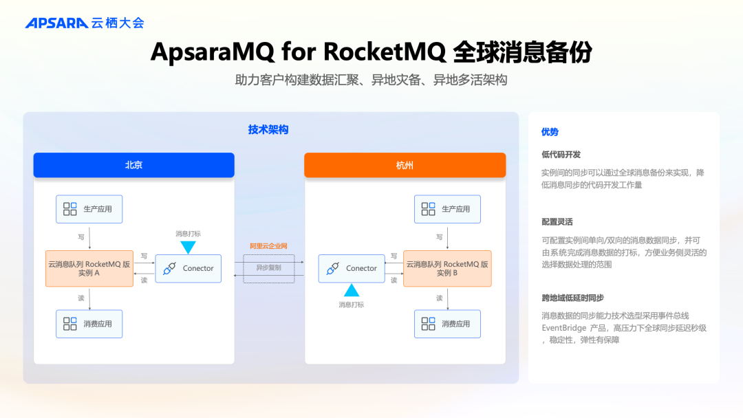 全球消息备份功能支持在一个国家内不同地域的多个 RocketMQ 实例间同步消息。每个实例都是具备读写服务的独立实例,实例间通过异步方式同步消息数据,适用于数据汇聚、异地容灾、异地多活等场景。其优势在于: