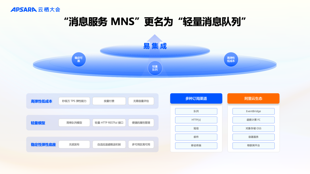 “消息服务 MNS”于 9 月 1 日正式更名为“轻量消息队列[1]”,旨在提供模型简单、易集成、高并发的消息队列产品,帮助开发者低成本快速构建分布式松耦合系统,高效传递数据和通知。
