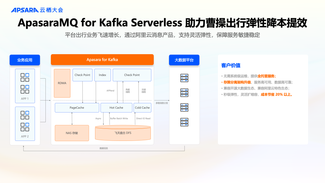 随着业务增长,曹操出行采用了 ApsaraMQ for Kafka Serverless 系列,凭借其秒级弹性扩展和按需付费,实现灵活扩缩容的同时,保证了服务的敏捷性和稳定性,节省了超过 20% 的成本。