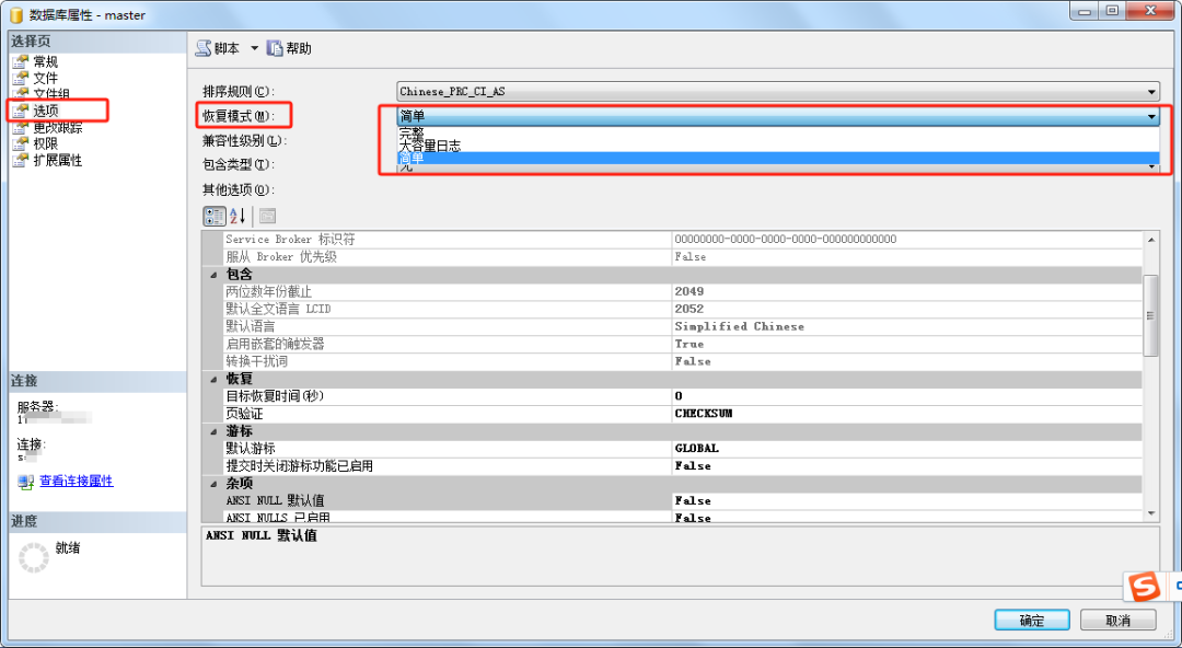 图文查看:可使用SQL Server Management Studio工具,选择相应的数据库,右键属性查看具体的数据库恢复模式,如下图所示: