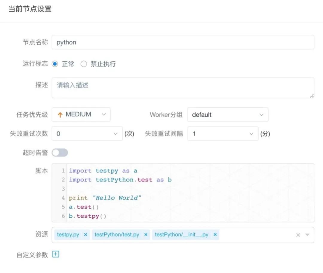 1、在创建工作流的时候拖出Python插件,填写节点名称,以及写入对应的Python脚本(图中资源栏的python文件需要在第2点中上传)。