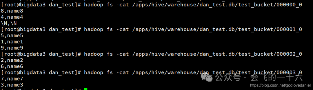 通过 clustered by(字段名) into bucket_num buckets 分桶,意思是根据字段名分成bucket_num个桶。drop table test_bucket;create table test_bucket (id int comment 'ID',name string comment '名字')comment '测试分桶'clustered by(id) into 4 bucketsROW FORMAT DELIMITED FIELDS TERMINATED BY ','location '/apps/hive/warehouse/dan_test.db/test_bucket';