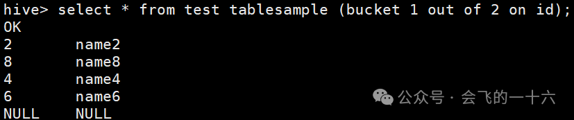 hive> select * from test tablesample (bucket 1 out of 2 on id);OK2 name28 name84 name46 name6