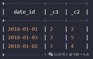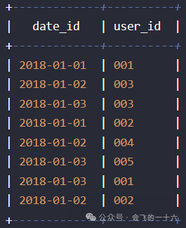 create table t3 asselect '2018-01-01 10:00:00' as time_id,'001' as user_idUNION ALLselect '2018-01-01 11:03:00' as time_id,'002' as user_idUNION ALLselect '2018-01-01 13:18:00' as time_id,'001' as user_idUNION ALLselect '2018-01-02 08:34:00' as time_id,'004' as user_idUNION ALLselect '2018-01-02 10:08:00' as time_id,'002' as user_idUNION ALLselect '2018-01-02 10:40:00' as time_id,'003' as user_idUNION ALLselect '2018-01-02 14:21:00' as time_id,'002' as user_idUNION ALLselect '2018-01-02 15:39:00' as time_id,'004' as user_idUNION ALLselect '2018-01-03 08:34:00' as time_id,'005' as user_idUNION ALLselect '2018-01-03 10:08:00' as time_id,'003' as user_idUNION ALLselect '2018-01-03 10:40:00' as time_id,'001' as user_idUNION ALLselect '2018-01-03 14:21:00' as time_id,'005' as user_id