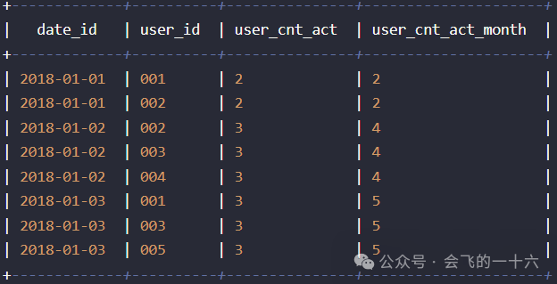 select date_id,user_id,count(user_id) over(partition by date_id) as user_cnt_act--注意求月的累计值时需要对用户去重,count(distinct user_id) over(partition by substr(date_id,1,7) order by date_id) as user_cnt_act_monthfrom(select substr(time_id,1,10) as date_id,user_idfrom t3group by substr(time_id,1,10),user_id) t