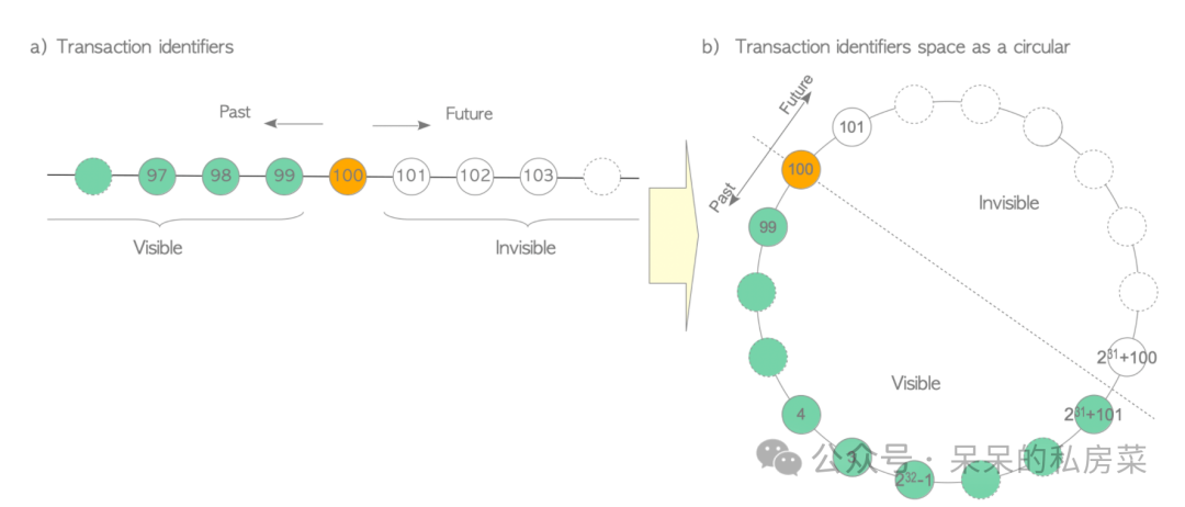 单纯看这个机制可以看出历史事务修改的记录的可见性可能发生反转。一个记录从“历史记录”变成“未来记录”,数据就莫名其妙的“丢失”了,这个现象就是本文我们要来分析的事务ID回卷问题。
