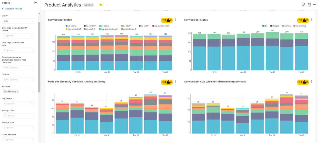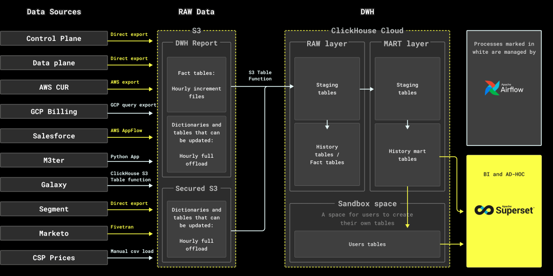 同样,我们的团队在内部也遵循这一理念。开发和运营我们的云数据库产品会生成大量数据,这些数据用于容量规划、定价、深入了解客户需求和财务报告。我们目前处理来自数十个数据源的数百TB数据,服务约一百名 BI 和临时查询用户……正如你所猜的,我们也是用 ClickHouse Cloud 来完成这些工作的 :)