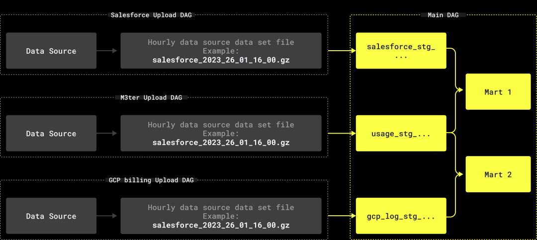 | Salesforce (CRM) | 自定义,~30 张表,每小时约 1 Gb | 包含客户账户、使用计划、订阅、折扣、区域、潜在客户及支持问题等信息。 |