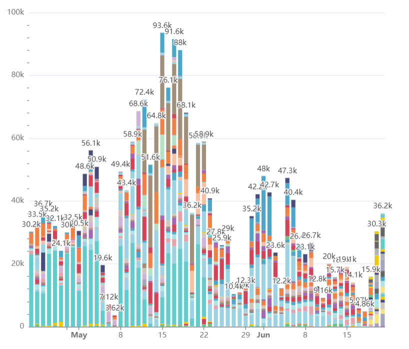我们的数据仓库已经稳定运行一年多,目前拥有 70 多名活跃用户、数百个仪表板和上千个图表。每天大约处理 40,000 次查询,下面的图表展示了每天查询量的变化,数据已按用户分类(系统用户和 ELT 用户除外):