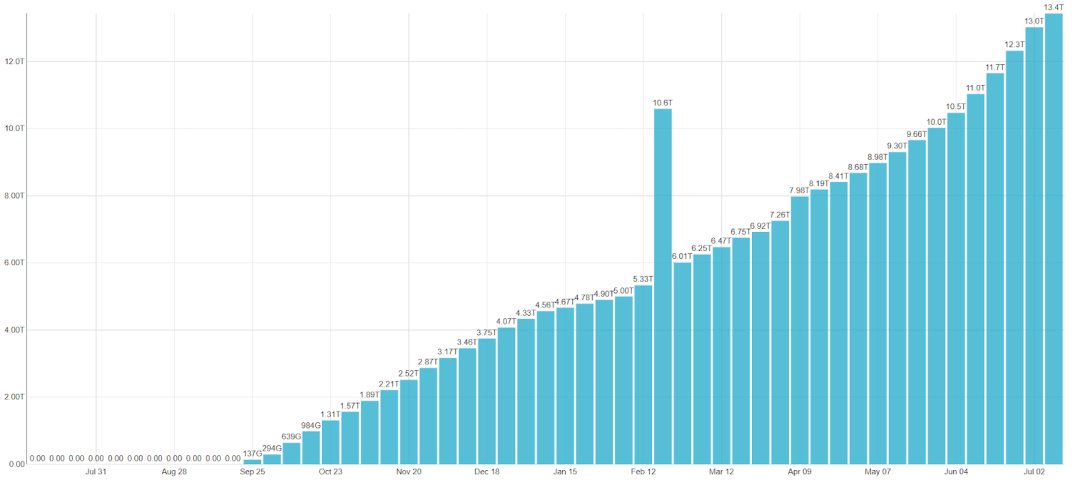 以下图表显示了我们数据仓库中的数据量每周增长的情况。2 月份的峰值是由于我们进行了一项内部实验,该实验需要对所有数据进行复制。