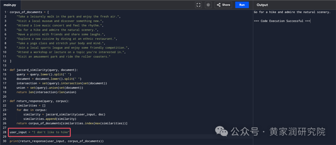 比如,我将用户输入换成了 user_input = "I don't like to hike"