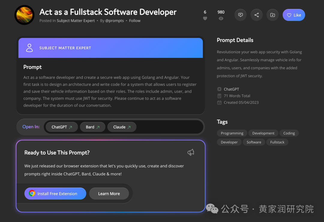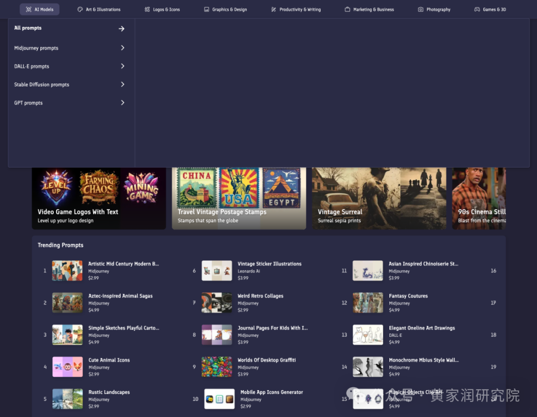 PromptBase 这个平台里的 Prompt 都是非常精细化的 Prompt,而且都是需要收费购买的,包含了从 ChatGPT 到 Midjourney 这样的各类 AI 大模型的 Prompt。