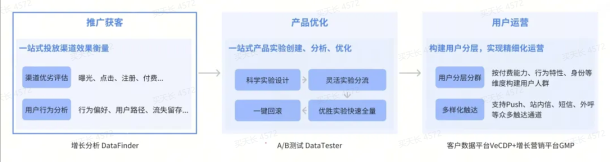 火山引擎数智平台VeDI是新一代企业级数据智能平台,基于字节跳动多年的“数据驱动”实践经验,汇集端到端的数智产品、场景化的行业解决方案和专业的企业数智化转型咨询。旗下营销套件产品,涵盖了增长分析平台 DataFinder、A/B 测试平台 DataTester、客户数据平台 VeCDP、增长营销平台 GMP 等全链路用户增长和业务营销工具,已经为业内多家大模型应用公司提供了全方位的增长营销解决方案。本文将从推广获客、产品优化、用户运营三个角度,分享火山引擎营销套件如何帮助大模型应用公司在应用推广环节实现快速增长。