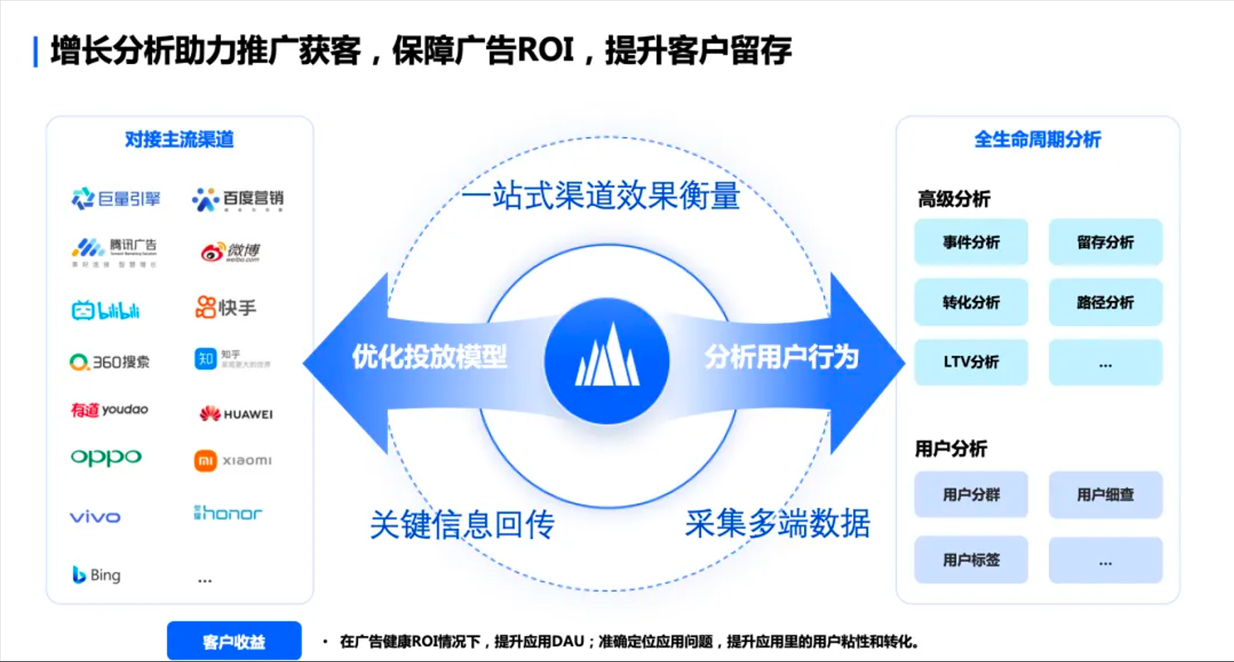 ● 推广获客:增长分析平台可提供全面的主流渠道效果评估,帮助优化广告投放 ROI。同时支持多端埋点,搭配完整的分析工具,全面洞察用户在应用内的转化、流失、留存等数据表现。