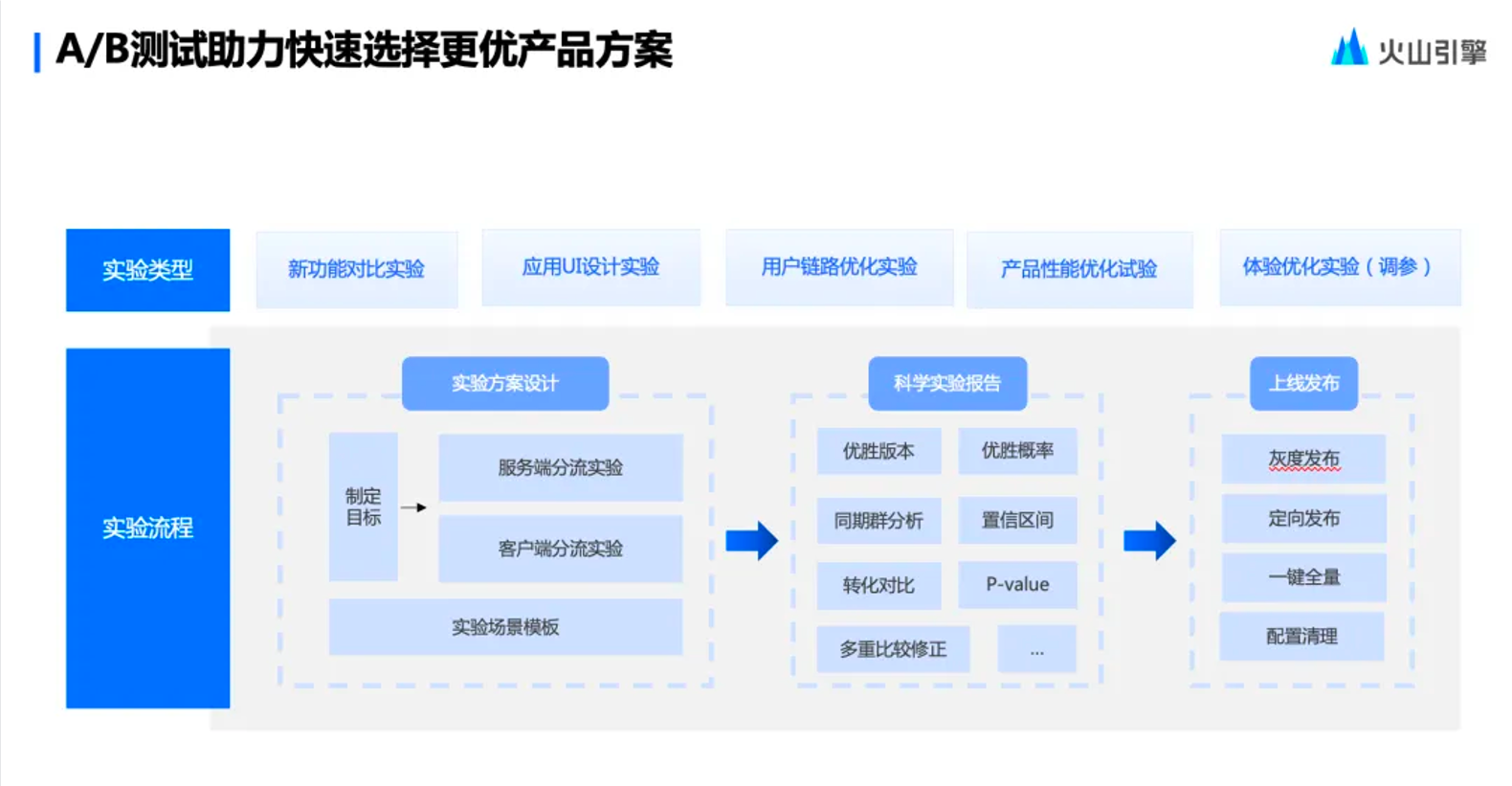 ● 产品优化:A/B测试平台可提供科学实验、快速全量和回滚能力,为高时效的产品迭代提供有效支撑。