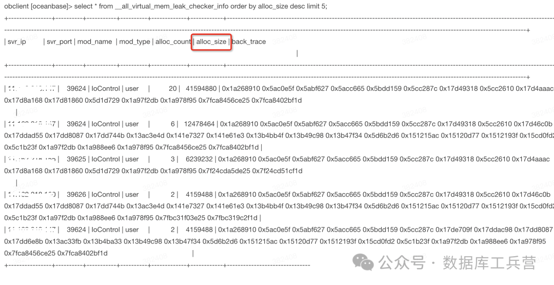 表的信息,执行语句如下。select * from __all_virtual_mem_leak_checker_info order by alloc_size desc limit 5;